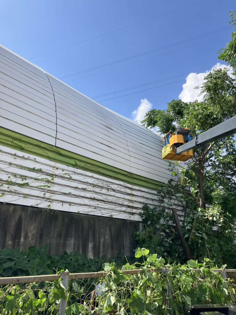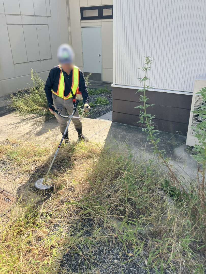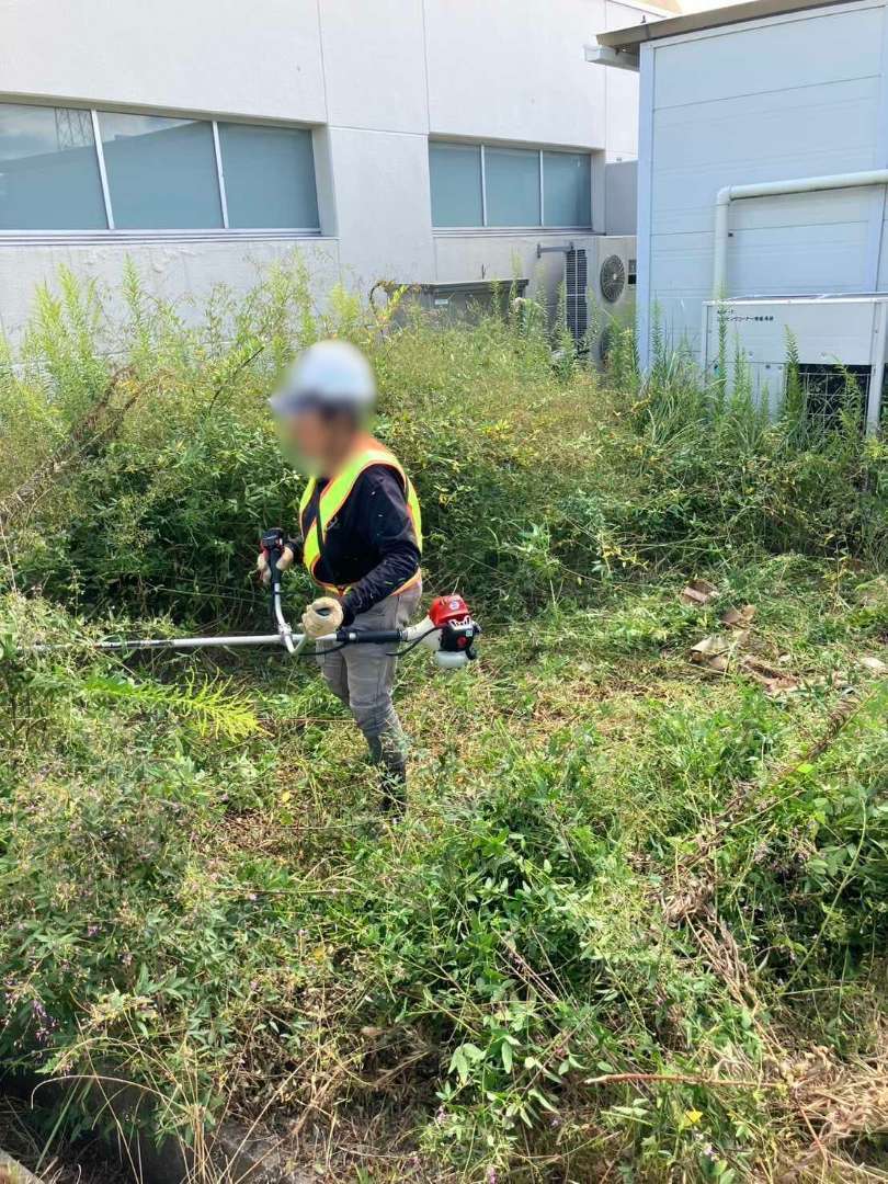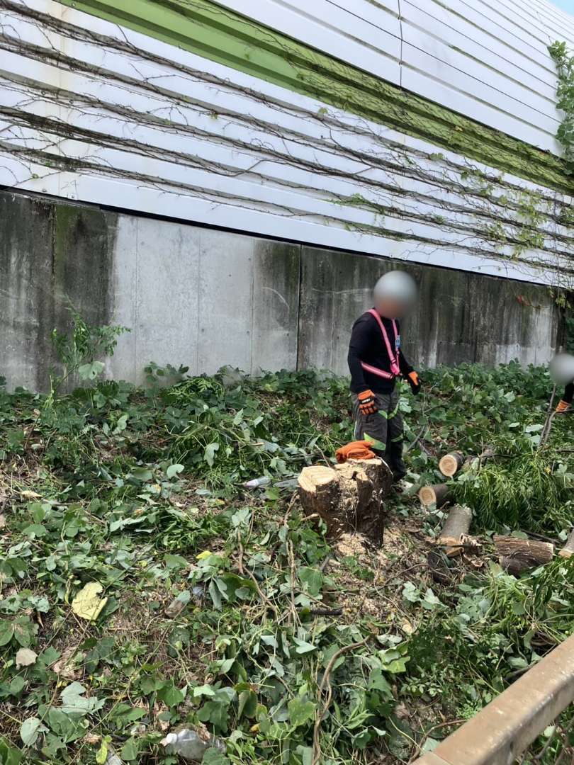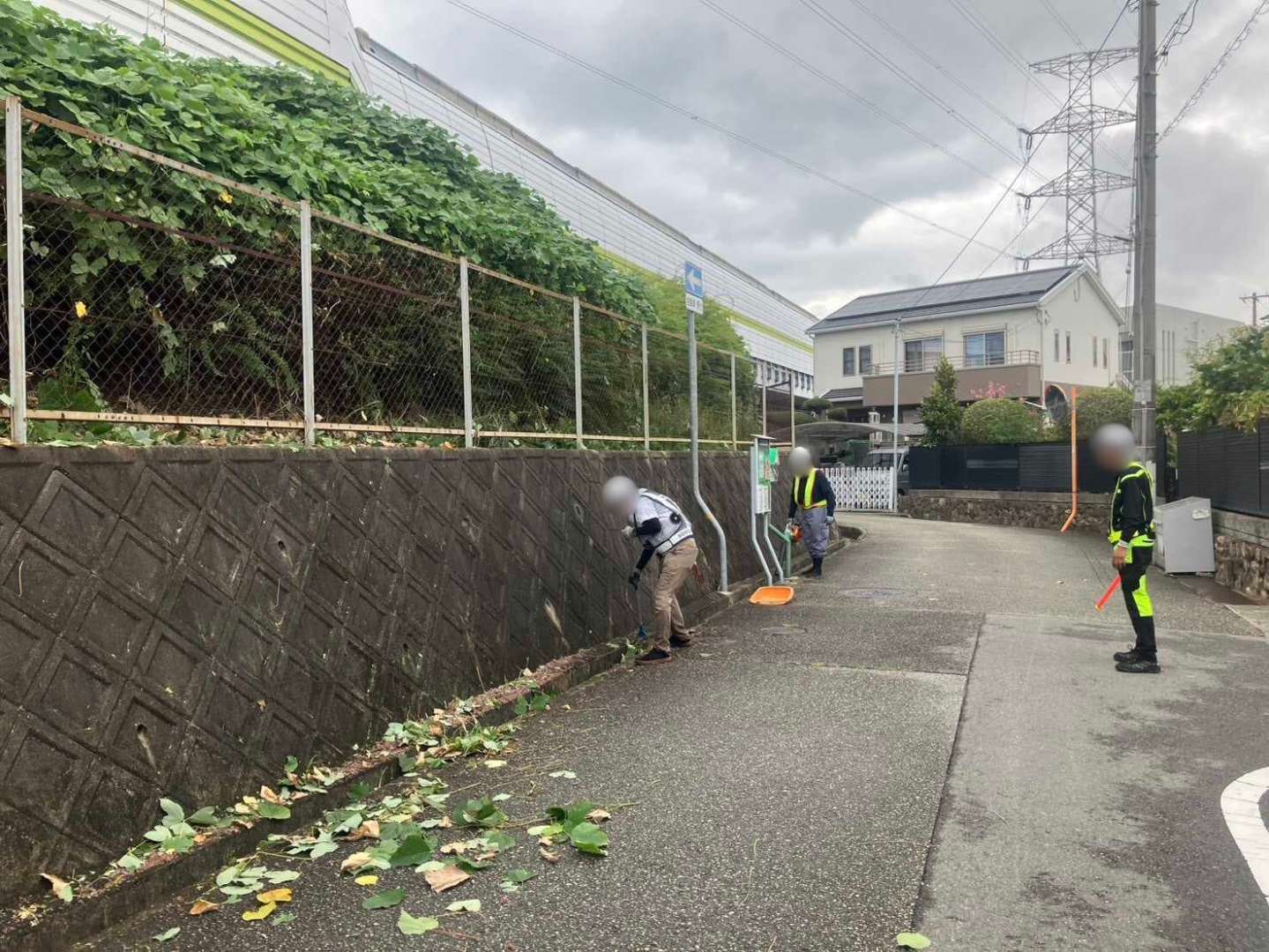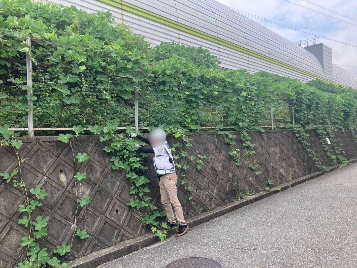 兵庫県宝塚市の施設外周で、フェンスと擁壁に繁茂したつる草・雑草を10月に一斉整備。事前の危険予知活動(KY)と近隣確認を行い、保安員が通行を誘導。高所部は剪定ばさみでつるを根元から切り離し、足元は刈払機で面整備。回収した枝葉はパッカー車で運搬し、仕上げにブロワーとほうきで路面を清掃しました。見通しと歩行空間が回復し、落葉の排水詰まりリスクも低減。Rs.株式会社が安全・迅速に緑地管理を実施しました。
